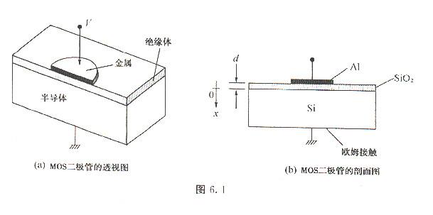 MOS二極管的透視結構如圖6.1(a)所示,圖6.1(b)為其剖面結構,其中d為氧化層的厚度,而V為施加于金屬平板上的電壓.在本節中,當金屬平板相對于歐姆接觸為正偏樂時,V為正值;而當金屬平板相對于歐姆接觸為負偏壓時,V為負值。