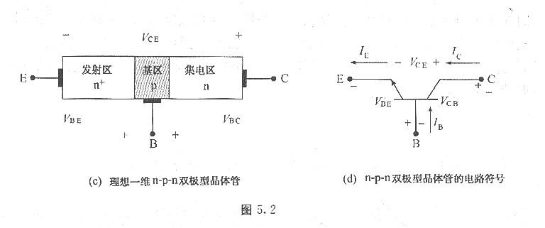 n-p-n雙極型晶體管的結(jié)構(gòu)與p-n-p雙極型晶體管是互補(bǔ)的,圖5.2(c)與圖5.2(d)分別是理想p-n-p晶體管的結(jié)構(gòu)與電路符號。將p-n-p雙極型晶體管結(jié)構(gòu)中的p換成n、n換成p,即為n- p-n雙極型晶體管的結(jié)構(gòu),因此電流方向與電壓極性也都相反.在下一小節(jié)中,我們將仔細(xì)討論p-n-p雙極型晶體管,因?yàn)槠渖贁?shù)載流子(空穴)的流動(dòng)方向與電流方向相同,可更直觀地了解電荷運(yùn)動(dòng)的機(jī)制,只要了解了p- n-p晶體管,我們只要將極性和摻雜類型調(diào)換,即可描述n-p-n晶體管