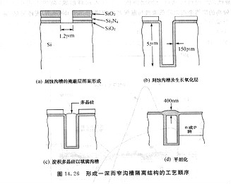 另一個例子為圖14. 27所示用于CMOS的淺溝槽隔離(shallow trench isolation)(深度小于lμm).在定義出圖形后(圖14。27(a),刻蝕出溝槽區域[圖14. 27(b》,接著重新填入氧化層[圖14.27(C)].在重新填人氧化層之前,可先停止用于溝道阻斷的離子注入,填入的氧化層高過溝槽,位于氮化硅上的氧化層應被除去,化學機械拋光( chemical-mechanicalpolishing,CMP)用來去除位于氮化硅上的氧化層以得到平整的外表[圖14.27(d)].由于氮化硅關于拋光具有高抵御性,所以氮化硅可當作CMP工藝中的掩蔽層,在拋光后,氮化硅和氧化層分別可用磷酸及氫氟酸去除.這個在一開端的平整化步驟,將有助于接下來定義出多晶硅的圖形及多層金屬連線工藝的平整化.