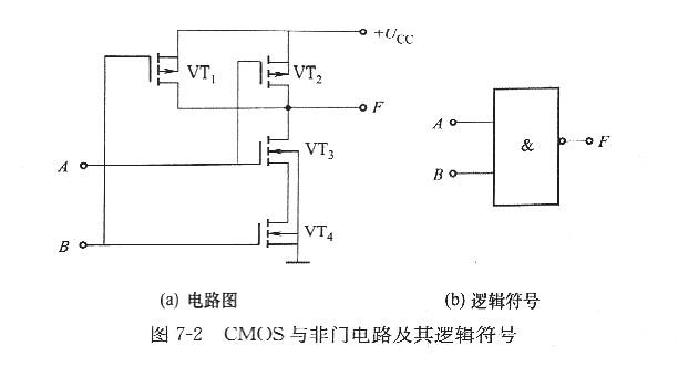 圖7-2為CMOS與非門電路及邏輯符號。