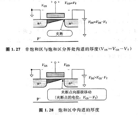 假如繼續(xù)增加漏極-源極間電壓VDS,以致于VDS=VGS-VT,這時(shí)的工作區(qū)域相當(dāng)于非飽和區(qū)與飽和區(qū)的分界處。由于柵極—漏極間電壓VGD=VGS-VDS=VT,所以柵極-漏極間電壓就與閾值電壓VT相等。就是說,如圖1. 27所示,漏區(qū)左近的溝道簡(jiǎn)直消逝了,把溝道消逝的狀態(tài)稱為夾斷。