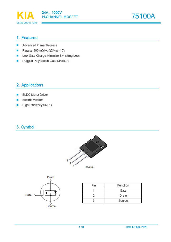 參數(shù): ID(A): 24 BVDSS(V): 1000 RDS(ON): 380mΩ Qg(nC): 180 Package: TO-264